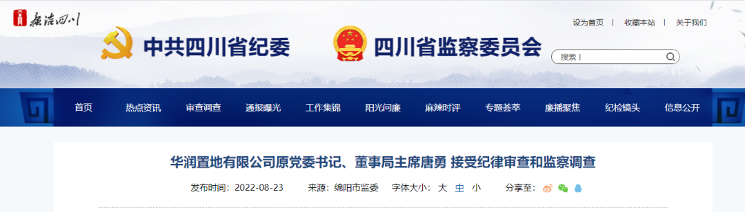 華潤置地有限公司原黨委書記、董事局主席、首席執(zhí)行官唐勇涉嫌嚴(yán)重違紀(jì)違法,目前華潤集團(tuán)紀(jì)委正對(duì)其進(jìn)行紀(jì)律審查,經(jīng)國家監(jiān)委指定四川省監(jiān)委管轄,四川省監(jiān)委指定綿陽市監(jiān)委管轄,綿陽市監(jiān)委正對(duì)其進(jìn)行監(jiān)察調(diào)查。