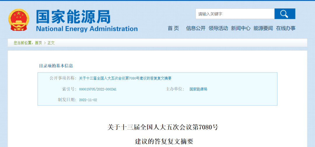 11月2日,國家能源局發布《關于十三屆全國人大五次會議第7080號建議的答復復文摘要》。