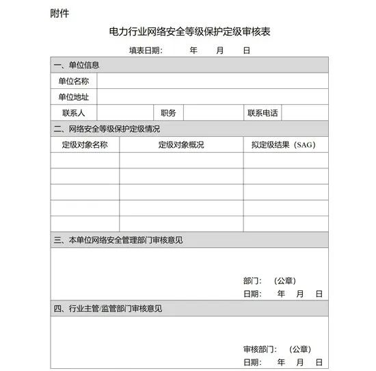 第九條 電力企業辦理網絡安全等級保護定級審核手續時,應當提交《電力行業網絡安全等級保護定級審核表》(詳見附件),含各定級對象的定級報告及專家評審意見。