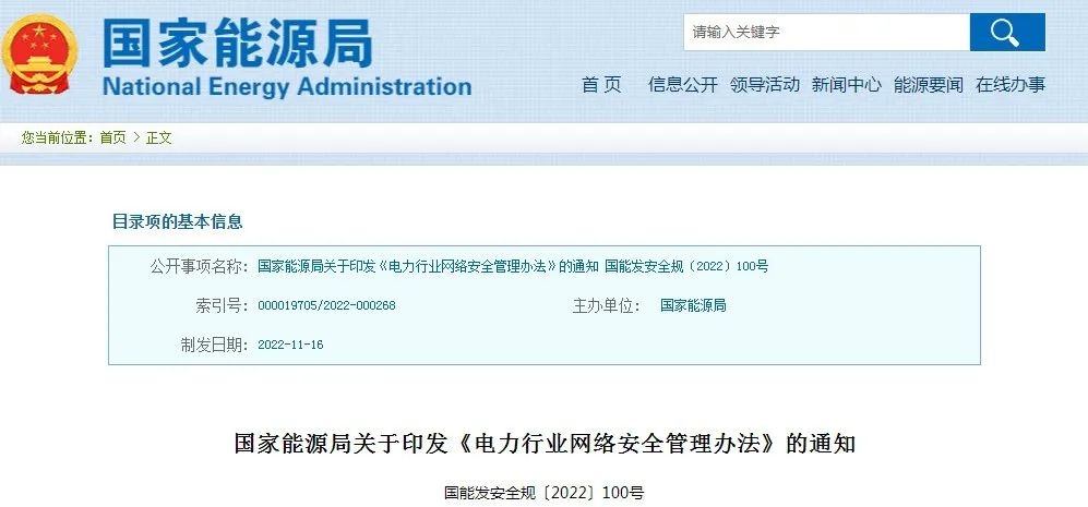 12月12日,國家能源局發布《電力行業網絡安全管理辦法》。