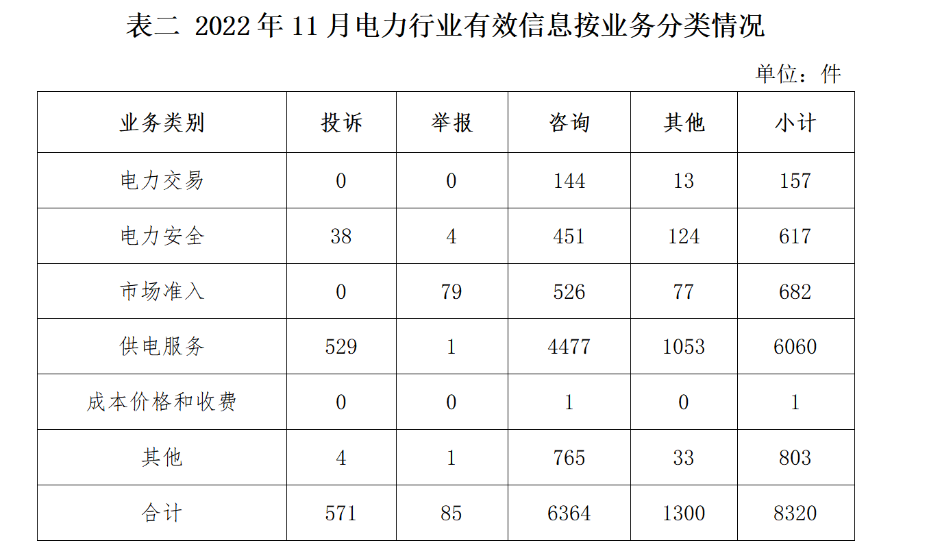 電力行業(yè)排在首位,有效信息數(shù)量為8320件,占全部有效信息的60.22%。群眾關(guān)注的內(nèi)容主要集中在供電服務(wù)、電力安全、市場(chǎng)準(zhǔn)入等方面。(2022年11月電力行業(yè)有效信息按業(yè)務(wù)分類情況見表二)