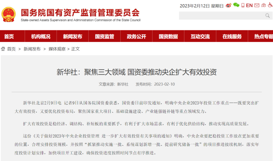 日前,國務院國資委印發(fā)《關(guān)于做好2023年中央企業(yè)投資管理 進一步擴大有效投資有關(guān)事項的通知》(以下簡稱《通知》),明確中央企業(yè)2023年投資工作三大重點領(lǐng)域:國家重大項目、基礎(chǔ)設(shè)施建設(shè)、產(chǎn)業(yè)鏈強鏈補鏈。