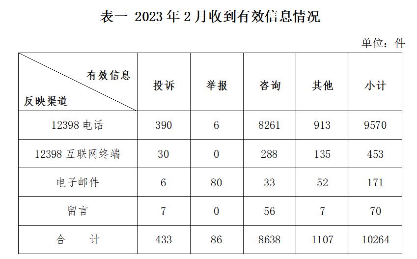 2023年2月,國家能源局12398能源監管熱線(以下簡稱12398熱線)共收到有效信息10264件(包含投訴、舉報、咨詢和其他訴求類別),環比減少27.07%,同比增加22.69%。(2023年2月收到有效信息情況見表一)