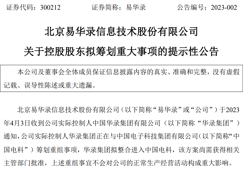 4月3日,北京易華錄信息技術股份有限公司發布公告稱,收到公司實際控制人中國華錄集團有限公司(以下簡稱“華錄集團”)通知,華錄集團正在與中國電子科技集團有限公司(以下簡稱“中國電科”)籌劃重組事項,華錄集團擬整合進入中國電科。易華錄表示,該方案尚需獲得相關主管部門批準,上述重組事宜不會對公司的正常生產經營活動構成重大影響。公司將按照法律法規的要求及時披露進展情況。