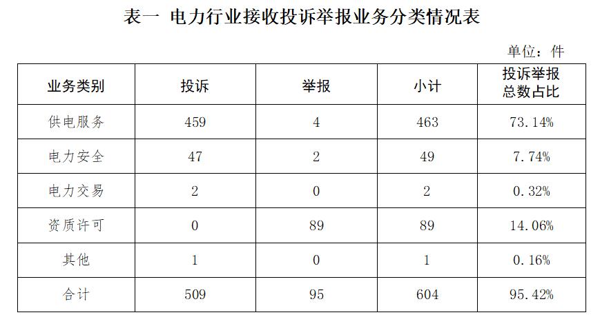 電力行業排在首位,數量為604件、占投訴舉報總數的95.42%,主要集中在供電服務、電力安全、電力交易、資質許可等方面。(詳見表一)