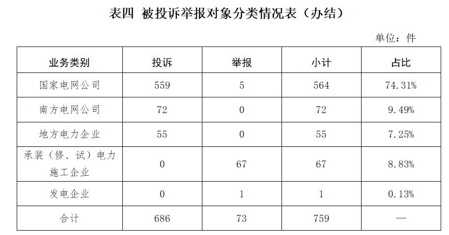 從被投訴舉報對象看,供電企業691件、占比91.04%,其中國家電網公司564件、占比74.31%,南方電網公司72件、占比9.49%,地方電力企業55件、占比7.25%;承裝(修、試)電力施工企業投訴舉報67件、占比8.83%;新能源企業投訴舉報1件、占比0.13%。(詳見表四)