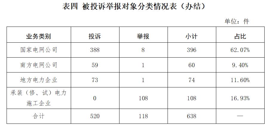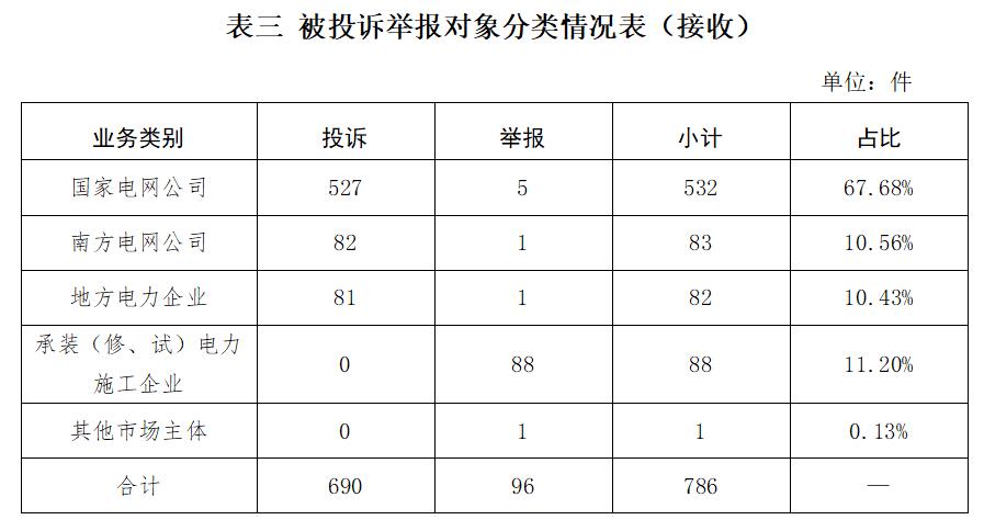供電企業697件、占投訴舉報總數的88.67%,其中國家電網公司532件、占投訴舉報總數的67.68%,南方電網公司83件、占投訴舉報總數的10.56%,地方電力企業82件、占投訴舉報總數的10.43%;承裝(修、試)電力施工企業88件、占投訴舉報總數的11.20%;其他市場主體1件、占投訴舉報總數的0.13%。