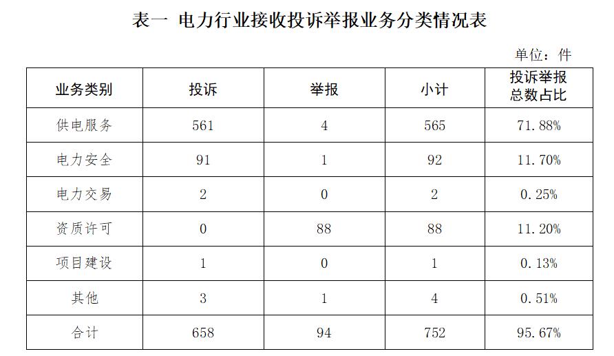 電力行業排在首位,數量為752件、占投訴舉報總數的95.67%,主要集中在供電服務、電力安全、資質許可等方面。