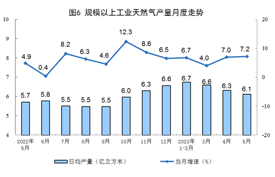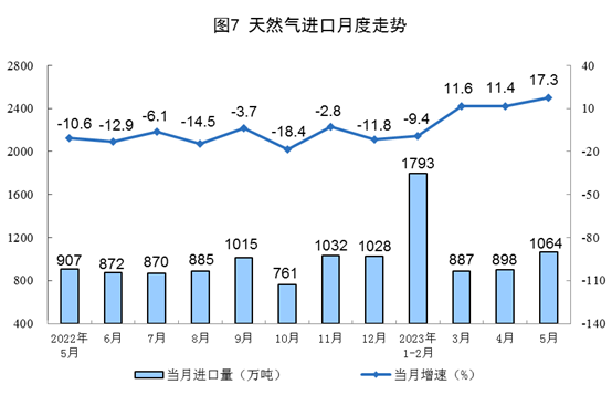 天然氣生產(chǎn)穩(wěn)步增長,進口增速加快。5月份,生產(chǎn)天然氣190億立方米,同比增長7.2%,增速比4月份加快0.2個百分點,日均產(chǎn)量6.1億立方米。進口天然氣1064萬噸,同比增長17.3%,增速比4月份加快5.9個百分點。