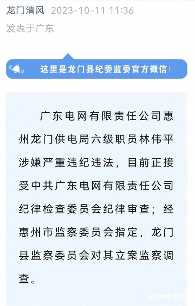 廣東電網有限責任公司惠州龍門供電局六級職員林偉平涉嫌嚴重違紀違法,目前正接受中共廣東電網有限責任公司紀律檢查委員會紀律審查,經惠州市監察委員會指定,龍門縣監察委員會對其立案監察調查。
