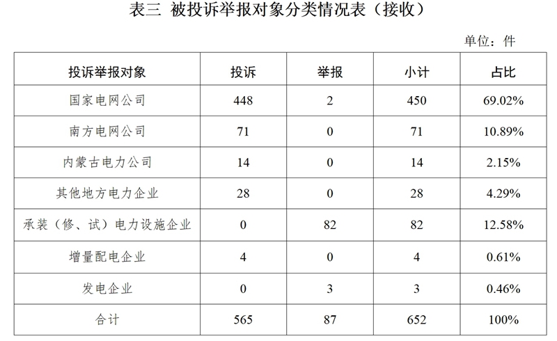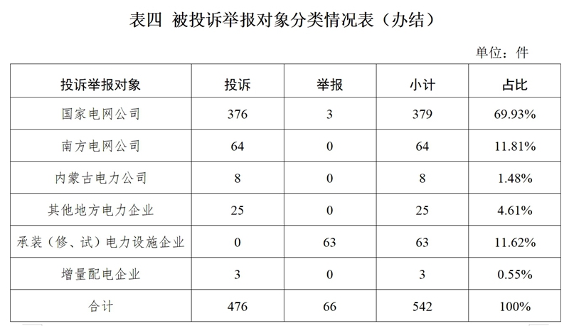 從被投訴舉報(bào)對象看,供電企業(yè)478件、占投訴舉報(bào)總數(shù)的88.37%,其中:國家電網(wǎng)公司379件、占比69.93%;南方電網(wǎng)公司64件、占比11.81%;內(nèi)蒙古電力公司8件、占比1.48%;其他地方電力企業(yè)25件、占比4.61%;承裝(修、試)電力設(shè)施企業(yè)63件、占比11.62%;增量配電企業(yè)3件、占比0.55%。