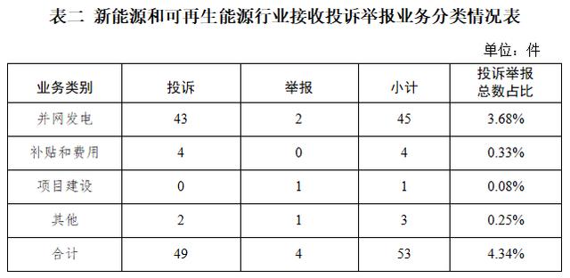 新能源和可再生能源行業排在第二位,數量為53件、占投訴舉報總數的4.34%,主要集中在并網發電方面。