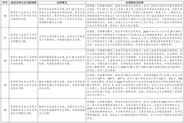針對群眾反映的投訴舉報,國家能源局派出機構嚴格根據國家有關法規政策規定進行處理。一是督促供電企業加強臺區等設備改造力度,縮短供電半徑,提高電網轉供、互供能力,解決故障停電、低電壓等電能質量問題;二是要求供電企業加強設備隱患排查整治、停電搶修管理,加大線路巡視頻次,及時消除隱患缺陷,增加搶修資源投入,提升設備管控和停電搶修能力,切實提高供電質量;三是通過行政處罰、監管約談、責令整改等方式,糾正有關企業違法違規行為,維護公平公正的市場秩序和群眾合法權益;四是通過解釋說明、澄清事實,消除群眾誤解。(2024年7月12398熱線典型投訴舉報事項具體處理情況,見附件2)