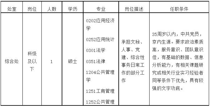 綜合處主任科員及以下崗位1人(京內(nèi)生源的碩士應(yīng)屆畢業(yè)生)。35周歲以內(nèi),中共黨員,要求政治素質(zhì)高,服務(wù)意識(shí)、團(tuán)隊(duì)意識(shí)佳,有基礎(chǔ)的數(shù)據(jù)、信息分析能力,同等條件下有相關(guān)課題研究或相關(guān)行業(yè)實(shí)習(xí)經(jīng)驗(yàn)者優(yōu)先,具有較強(qiáng)的文字功底。具體要求詳見(jiàn)下表。