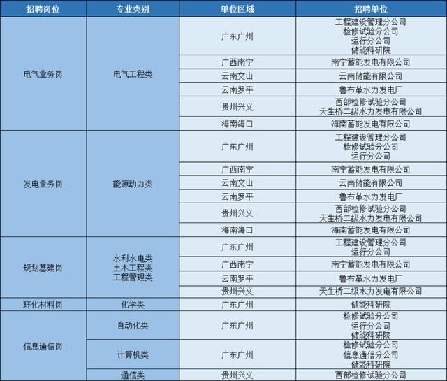 招聘單位涵蓋廣東、廣西、云南、貴州、海南五省。招聘崗位包括電氣業務崗、發電業務崗、規劃基建崗、環化材料崗、信息通信崗。具體要求如下
