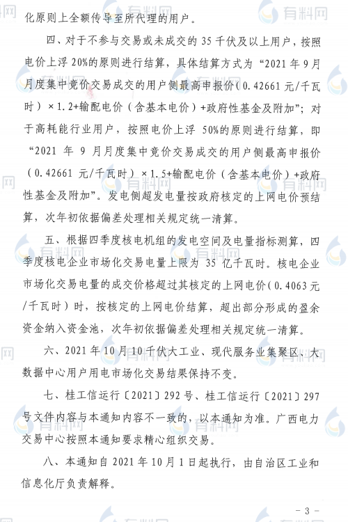 廣西發(fā)布《自治區(qū)工業(yè)和信息化廳關(guān)于進(jìn)一步調(diào)整2021年全區(qū)電力市場化交易方案的緊急通知》,在緊急通知中,高耗能企業(yè)電價(jià)直接上浮50%進(jìn)行結(jié)算。
