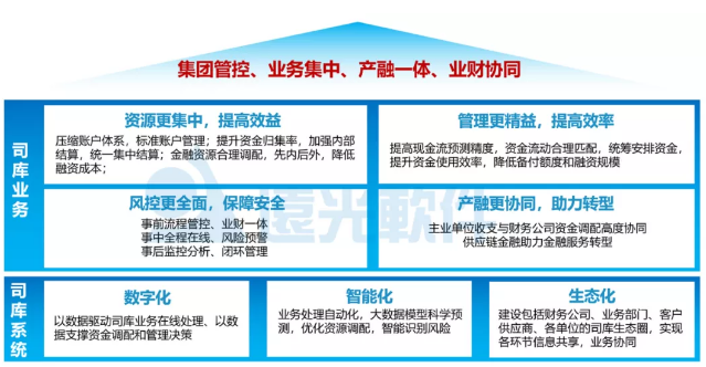 結合集團企業發展需求和業界實踐經驗,司庫管理體系建設需滿足“資源更集中、管理更精益、風控更全面、產融更協同”四個標準,以數字化、智能化的司庫管理信息系統為支撐,以“集團管控、業務集中、產融一體、業務協同”為管理目標。