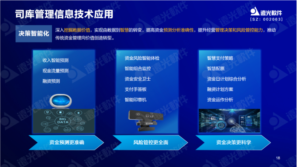 遠光軟件首先構建了各類預測模型融入至資金各個業務場景中,助力資金預測更準確。其次結合軟硬件機器人,通過采用遠光資金風險智能體檢、資金安全衛士等智能硬件,使資金風險管控更全面。第三,在業務場景中通過智慧支付策略、資金日計劃綜合分析等智能化管理手段,使得資金決策更科學。