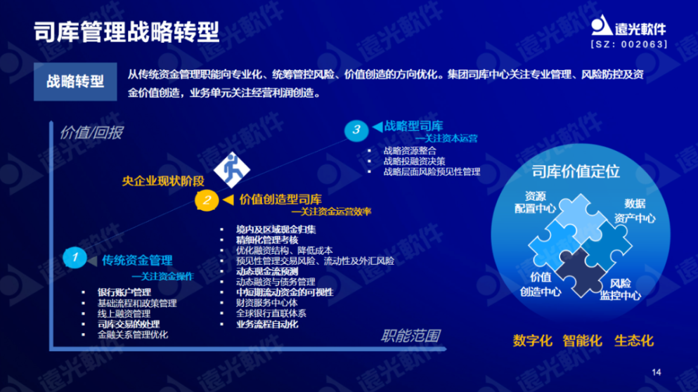 通過運用數字技術減少大量財務操作層面工作,財務人員核心重點將轉移至戰略層與分析層,將資金被動管理轉變為主動管理、超前管理,實現金融資源的可視、可控和增值。