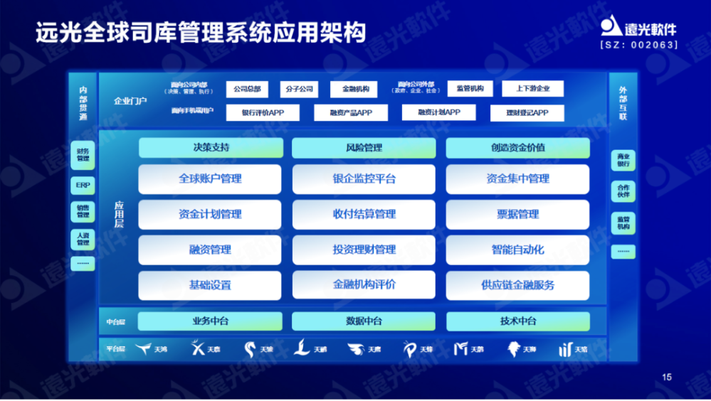 遠光全球司庫管理系統依托底層技術支撐平臺遠光九天智能一體化云平臺,及中臺層(業務中臺、數據中臺、技術中臺),構建16類司庫核心業務應用,以支撐企業資金決策、管控資金風險、創造資金價值。