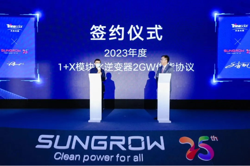 天合智慧能源許凌女士在簽約現場表示:“與陽光電源一樣,天合光能今年也25歲了,雙方一起在光伏行業砥礪前行,都取得了長足的發展。多年來,我們見證陽光電源始終保持著蓬勃的創新活力和高質量的產品輸出。這次與陽光電源簽訂了2GW的‘1+X’模塊化逆變器供貨協議,期待用陽光的逆變新品,打造出更好的光伏電站。”