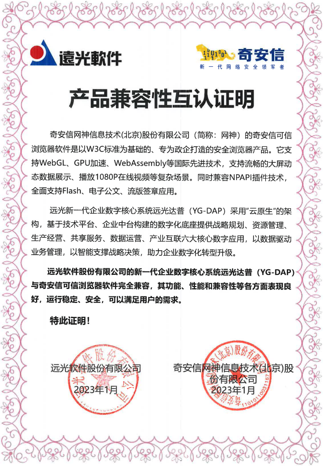 近日,新一代企業數字核心系統遠光達普(YG-DAP)與奇安信可信瀏覽器完成產品兼容性互認證。經雙方聯合測試,二者完全兼容,功能、性能和兼容性方面表現良好,運行穩定高效,滿足用戶需求。