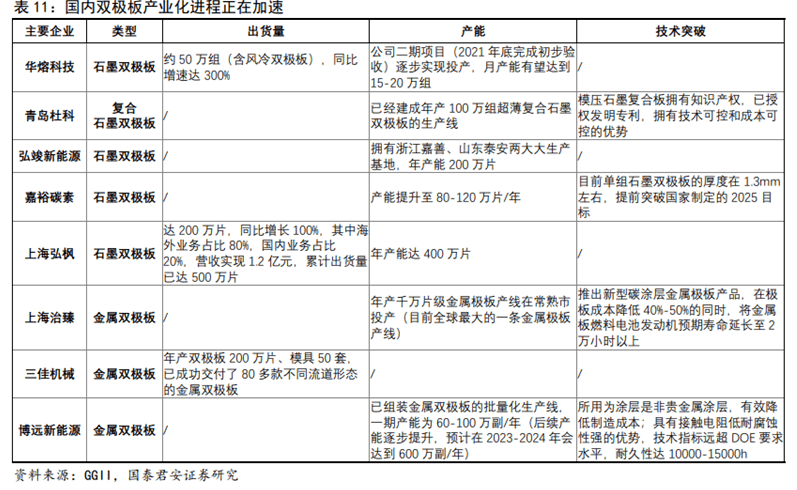 國內產業化進程正在加速:據GGII統計,2021年期間,國內主流雙極板企業出貨量增長顯著,金屬雙極板領域已出現單個企業單個客戶出貨達百萬片級別的現象;石墨板市場各家出貨也均有較大增長,表現明顯的是原萬片級出貨企業的出貨量級達到10萬片以上,頭部企業的出貨更是達到了50萬片/年以上。