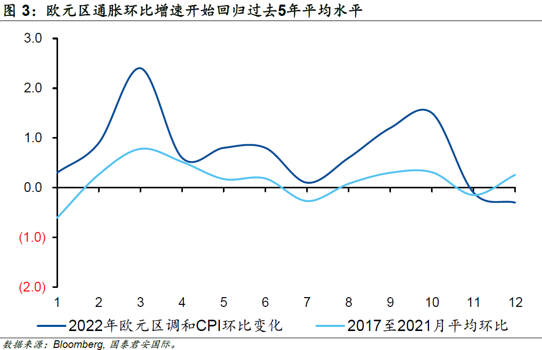 另一方面,歐元區通脹環比增速顯著高于季節性的趨勢已經開始扭轉,這意味著通脹的增長動能開始減弱,2022年11月及12月已經連續兩個月低于歷史平均水平。