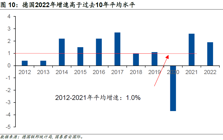 作為歐元區最大的經濟體,近日公布的數據顯示,經過價格調整后,德國2022年GDP同比增長1.9%,高于市場預期1.8%。不可否認的是,俄烏沖突推升的天然氣價格給德國經濟造成了相當大的困擾,但是德國2022年GDP依舊增長1.9%,較2019年(新冠疫情開始前一年)高0.7個百分點,亦高于2012年至2021年的十年平均水平(1.0%)。