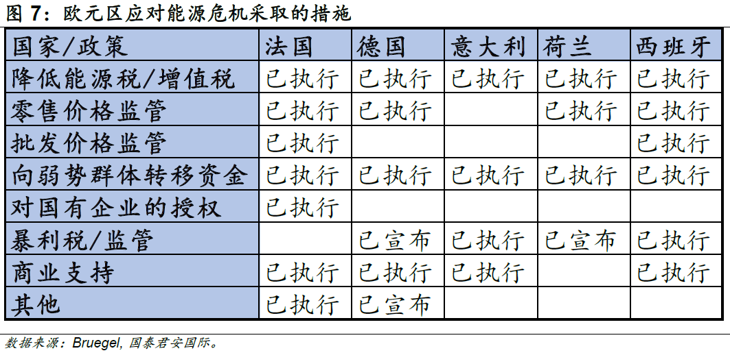 從總量政策來看,財政端的支持在很大程度上減輕了能源危機的沖擊。為應對俄烏沖突帶來的能源問題,歐洲各國不約而同地采取了多種財政措施。根據Bruegel的統計,歐洲各國已經撥款7,055億歐元用于緩解能源危機帶來的影響。歐盟撥款總計6,004億歐元,其中德國支出2,640億歐元,占2021年GDP的7.4%;英國撥款970億歐元,占2021年GDP的3.5%。