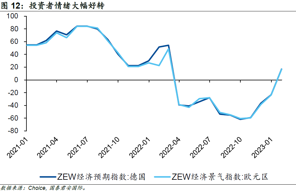 往前看,反映歐元區及德國投資者情緒的指標“ZEW經濟景氣指數”大幅好轉。在能源問題好轉、中國經濟向好的背景下,能源密集型企業及出口型企業的盈利預期也開始上修,2023年1月德國ZEW經濟景氣指數錄得16.9,遠超預期值-15及前值-23.3。