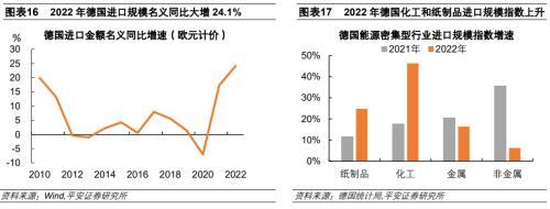 德國(guó)通過(guò)大量進(jìn)口能源密集型產(chǎn)品來(lái)彌補(bǔ)本國(guó)產(chǎn)能缺口,體現(xiàn)為2022年德國(guó)化工品和紙制品進(jìn)口規(guī)模指數(shù)大幅上升。2011年以來(lái),德國(guó)進(jìn)口規(guī)模較為穩(wěn)定。2021年德國(guó)進(jìn)口規(guī)模增長(zhǎng)17.3%,2022年德國(guó)進(jìn)口規(guī)模大幅增長(zhǎng)24.1%。從能源密集型行業(yè)來(lái)看,剔除價(jià)格因素后,2022年化工和紙制品進(jìn)口規(guī)模指數(shù)大幅上升,分別增長(zhǎng)46.4%和24.8%,金屬和非金屬2022年進(jìn)口增速則低于2021年增速。