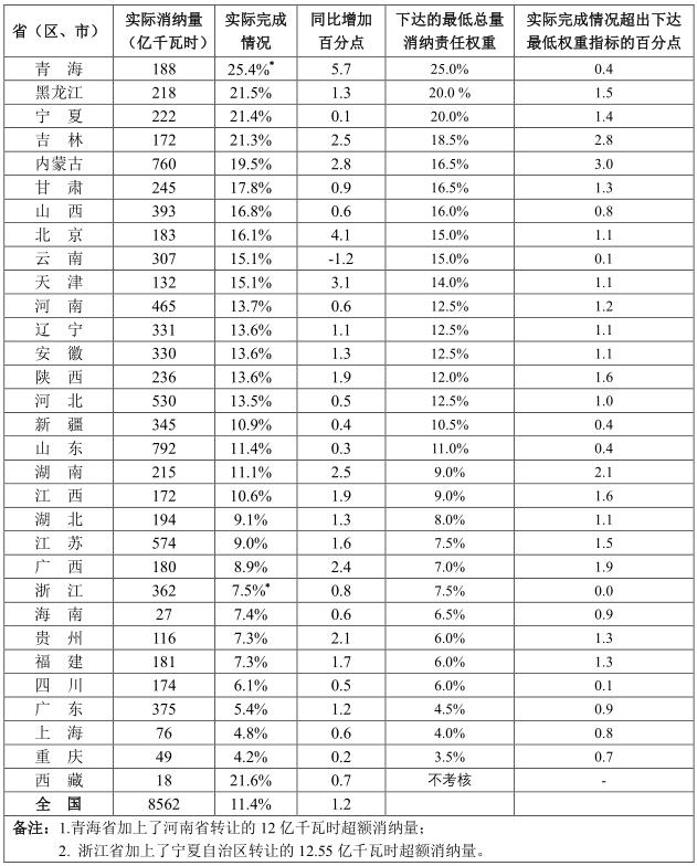 二、各省(區(qū)、市)可再生能源電力消納責(zé)任權(quán)重完成情況