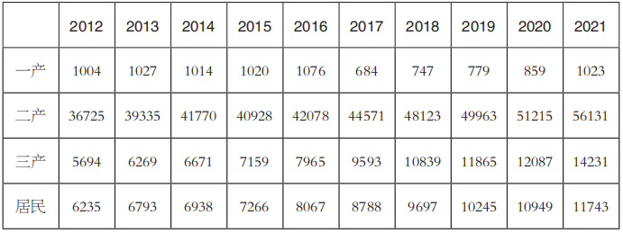 表1 2012~2021年分產業用電量(單位:億千瓦時)