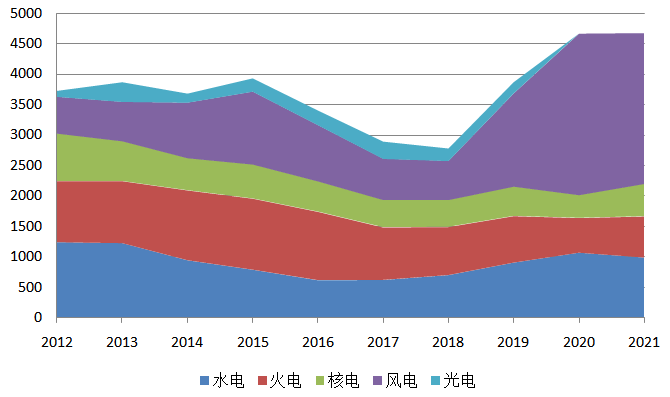 圖19 2012~2021年不同電源投資情況(單位:億元)