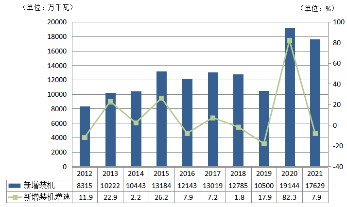 圖7 2012~2021年全國新增電力裝機及增速情況