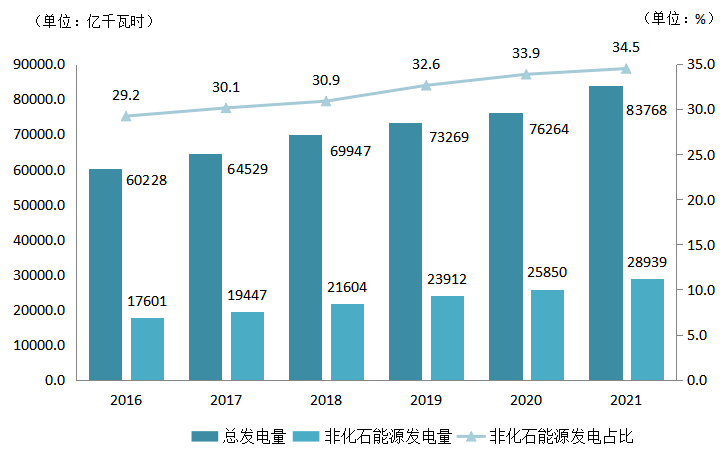 圖13 2016~2021年全國發電量及非化石能源發電占比情況