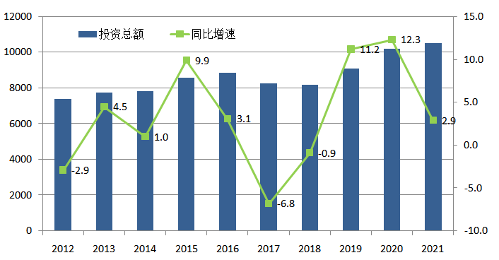圖17 2012~2021年全國電力投資總量及增速情況(單位:億元,%)