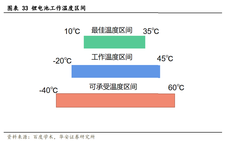 在高溫環(huán)境下,鋰電池內(nèi)部的 SEI 膜首先分解,隨后負(fù)極材料與電解液產(chǎn)生反應(yīng)、 隔膜熔融,最終正極材料及電解液發(fā)生分解。這些變化會(huì)導(dǎo)致鋰離子通道發(fā)生閉塞,引 起正負(fù)極直接接觸、短路,從而放出大量熱和氣體,導(dǎo)致內(nèi)部壓力增加,發(fā)生如電池鼓 包、破裂、泄壓閥破裂、鋁箔熔化等熱失控現(xiàn)象。熱失控一旦發(fā)生,電池內(nèi)部溫差可達(dá) 520 ℃,對(duì)安全性帶來(lái)嚴(yán)峻挑戰(zhàn)。此外,高溫會(huì)導(dǎo)致電池內(nèi)阻增加、活性材料和有效鋰 離子流失,進(jìn)而降低電池容量。 在低溫環(huán)境下,電池負(fù)極會(huì)析鋰形成鋰枝晶,嚴(yán)重時(shí)刺穿 SEI 膜,影響安全性。低 溫會(huì)導(dǎo)致電解液凝固,阻抗增加,進(jìn)而降低電池容量,根據(jù)《鋰離子電池低溫特性研究 進(jìn)展》,磷酸鐵鋰電池容量保持率 0 ℃下為 60%-70%,在−20 ℃時(shí)降低至 20%-40%。除 溫度外,電池間溫差亦會(huì)對(duì)電池性能產(chǎn)生影響。