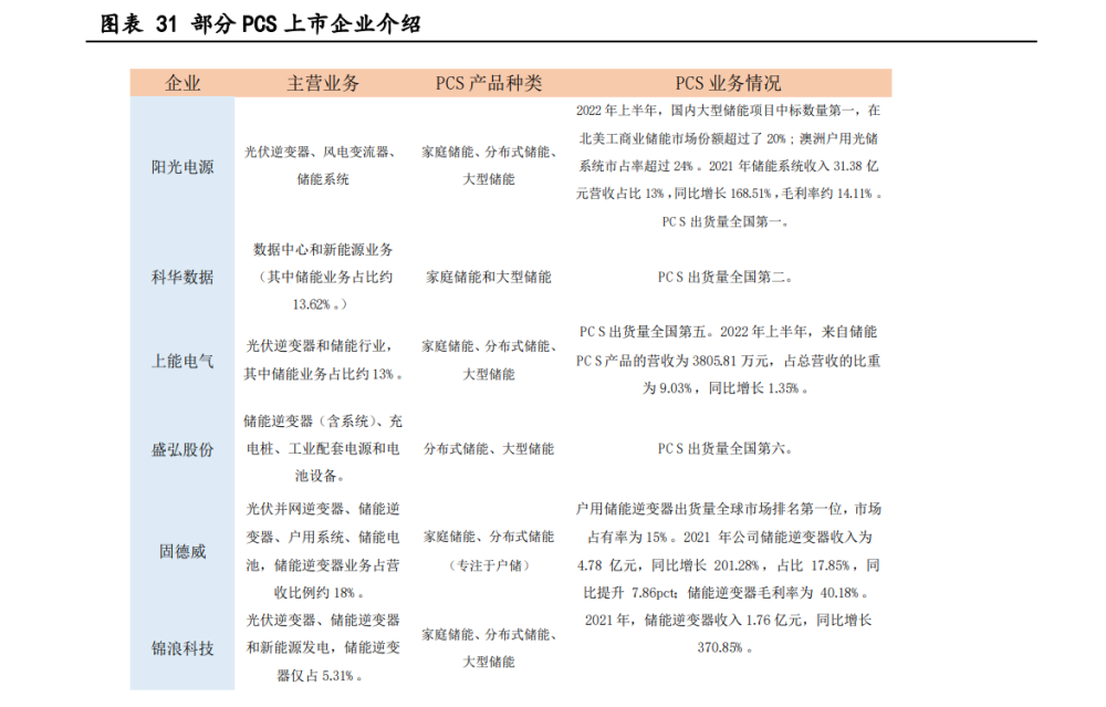 2021 年,中國(guó)新增投運(yùn)的電化學(xué)儲(chǔ)能項(xiàng)目中,裝機(jī)規(guī)模排名前十位的儲(chǔ)能逆變器提 供商,依次為:上能電氣、科華數(shù)能、索英電氣、南瑞繼保、陽(yáng)光電源、盛弘股份、華 自科技、智光儲(chǔ)能、匯川技術(shù)和許繼。 目前從事逆變器的上市企業(yè)主要有上能電氣、固德威和錦浪科技等。從產(chǎn)品結(jié)構(gòu)來(lái) 看,上能電氣、固德威以光伏逆變器為主,錦浪科技以組串式逆變器為主。從營(yíng)收來(lái)看, 錦浪科技營(yíng)收位于行業(yè)較高水平,2021 年為 33.12 億元。從營(yíng)收增速看,固德威成長(zhǎng)較 快,2021 年?duì)I收增速達(dá) 68.53%,毛利率達(dá)到 31.7%,凈利率達(dá) 10.4%。隨著國(guó)內(nèi)逆變器 企業(yè)快速發(fā)展,國(guó)產(chǎn)逆變器在海外的競(jìng)爭(zhēng)優(yōu)勢(shì)凸顯。受到國(guó)內(nèi)市場(chǎng)政策波動(dòng)影響,尤其 是 2018 年 531 新政后,國(guó)內(nèi)逆變器企業(yè)加快拓展海外渠道,加速海外布局。2021 年, 全球逆變器出貨量前十大公司中中國(guó)企業(yè)獨(dú)占 6 席,其中華為、陽(yáng)光電源逆變器出貨量 分列全球第一、第二,分別為 52GW 和近 48GW,第三名為海外公司,其出貨量為 15GW 左 右,與華為、陽(yáng)光電源存在較大差距。