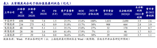 五家煤炭央企具備提估值基礎(chǔ)。煤炭行業(yè)共有五家央企,分別為中國神華(隸屬國家能源投資集團)、中煤能源(隸屬中煤能源集團)、電投能源(隸屬國家電力投資集團)、新集能源(隸屬中煤能源集團)和上海能源(隸屬中煤能源集團)。五家煤炭央企中,除中國神華估值相對更高外,其他估值普遍較低,中煤能源集團旗下三家上市公司市凈率均處于破凈狀態(tài)。從凈資產(chǎn)收益率看,五家煤炭央企2022年前三季度ROE均超過15%,均處于高盈利狀態(tài)。從貨幣資金和未分配利潤看,中國神華、中煤能源、電投能源均有較多未分配利潤,具備高分紅基礎(chǔ)。截至2022年三季度,中國神華未分配利潤/2022E凈利潤、貨幣資金/2022E凈利潤分別為3.9和2.6,未分配利潤和貨幣資金均遠超2022年凈利潤,2022年或?qū)⒕S持2021年的100%分紅比例,對應(yīng)當(dāng)前股價,股息率超過12%,高股息率下,中國神華仍具備提估值基礎(chǔ)。截至2022年三季度,中煤能源未分配利潤/2022E凈利潤、貨幣資金/2022E凈利潤分別為2.8和3.9,中煤能源在手貨幣資金充裕,2021年分紅比例為30%,2022年存在提高分紅比例的可能,若2022年分紅比例達到60%,對應(yīng)當(dāng)前股價,股息率與中國神華相當(dāng),而其PE/PB估值明顯偏低,且PB已低于1倍,存在大幅提估值可能。截至2022年三季度,電投能源未分配利潤/2022E凈利潤、貨幣資金/2022E凈利潤分別為3.5和0.7,電投能源未分配利潤較多,但貨幣資金相對偏少,主因公司在建綠電項目較多,綠電轉(zhuǎn)型理應(yīng)為公司帶來更高的估值。