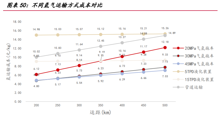 氣氫拖車是目前國內最成熟的氫氣運輸形式,我國氫氣管束式集裝箱和氫氣長管 拖車大多采用鋼制大容積無縫高壓氣瓶和鋼制內膽碳纖維環向纏繞氣瓶,工作壓力通 常為 20Mpa,單次運輸氫氣質量小,運輸效率低,適用于 200 公里以內的短距離運輸。 綜合市場上管束式氫氣集裝箱的平均輸氫量,假設 20/30/45MPa 管束式集裝箱最大可 運輸氫氣質量 340/650/950 千克,管束式集裝箱費用 60/70/80 萬,單位壓縮電耗 2/4.5/6kWh/kg,則運距 500 公里的運輸成本高達 7 元/kg 以上。