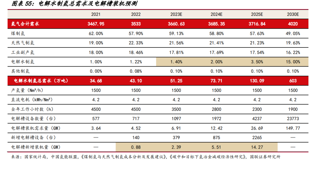 從供給端來看,電解水制氫占比有限,并不能完全解決新能源消納問題。我們假 設(shè) 2023-2025 年新能源裝機為 160/200/200GW,則 2023-2025 年電解槽總裝機占新能 源總整體比例僅為 0.75%/1.11%/2.03%,新增電解槽占新增新能源裝機的比例僅為 1.49%/2.76%/7.13%。可見,新能源消納仍需火電靈活性改造、抽水蓄能、新型儲能、 需求側(cè)響應(yīng)等多管齊下,共同解決。 根據(jù)中國氫能聯(lián)盟預(yù)測,至 2030 年,電氫下游需求替代滲透率可達 15%,屆時, 占可再生能源供給比例僅達 6.46%,供給和需求側(cè)均無明顯的產(chǎn)業(yè)發(fā)展瓶頸,經(jīng)濟性 成為驅(qū)動產(chǎn)業(yè)放量的首要因素。