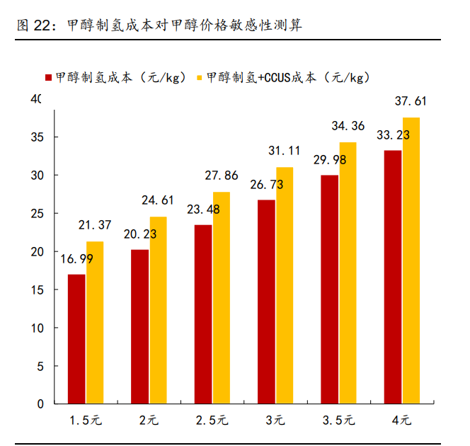 3)甲醇制氫成本測算——單位成本約 23 元/kg,考慮碳捕集 28 元/kg