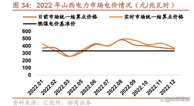 乘市場化改革春風,各地區電力市場交易價格 2022 年均大幅上浮。年度電力交易方面,2023 年山西省雙邊協商與 集中競價電力直接交易成交均價分別為 393.72 元/兆瓦時與 385.74 元/兆瓦時,比去年同期增長 0.01%與 7.43%;廣 東省年度雙邊協商交易與掛牌交易價格分別為 553.88 元/兆瓦時與 552.28 元/兆瓦時,比去年同期增長了 11.44%與 9.97%。月度價格方面,2022 年山西、廣東電力交易市場的日前市場結算價格與實時市場統一結算價格均有所增長, 且在年末均顯著高于當地燃煤電價基準價。2022 年 9 月,廣東省日前市場結算價格與實時市場統一結算價格一度攀 升到 743.06 元/兆瓦時與 817.27 元/兆瓦時,相較年初增長 70%。