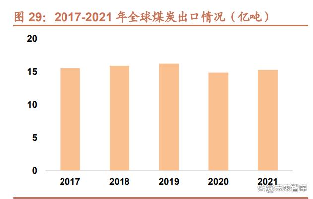 地緣政治局勢變化影響能源市場,全球動力煤價格高企抬升中國動力煤進口成本。受疫情影響,2020 年以來全球煤 炭出口數量持續下降,2020 年全球煤炭出口總量為 14.86 億噸,較 2019 年下降 8.3%,2021 年回升至 15.27 億噸, 但仍低于 2019 年水平。而地緣政治局勢的惡化則進一步影響了煤炭市場,2022 年動力煤供應進一步惡化。2022 年 1 月,印尼政府為緩解國內電廠缺煤形勢宣布 1 月內禁止出口煤炭,引發國際煤炭市場震蕩,海運煤市場供給大幅減 少,煤價開啟上行之路。2022 年 2 月,俄烏沖突爆發,美國與歐盟對俄羅斯實行能源禁運,俄羅斯 3 月以來煤炭、 石油、天然氣出口量均大幅下降,煤炭出口的下降直接沖擊了全球動力煤市場,而天然氣出口的下降使得歐洲出現較 大程度的能源短缺,歐洲多國被迫重拾其他替代能源,煤電也包括在內,根據國際能源署的統計,2022 年歐洲燃煤 發電量同比增長 6%,歐洲能源結構的變化加劇了全球煤炭供給的短缺。2022 年中國的動力煤進口成本飆升。