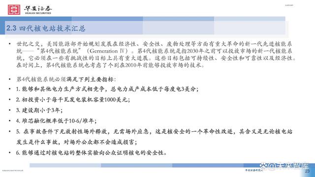 世紀(jì)之交,美國能源部開始規(guī)劃發(fā)展在經(jīng)濟(jì)性、安全性、廢物處理等方面有重大革命的新一代先進(jìn)核能系 統(tǒng)——“第4代核能系統(tǒng)”(Gerneration Ⅳ)。第4代核能系統(tǒng)是指2030年之前可以投放市場的新一代核能系 統(tǒng),它必須在一些有挑戰(zhàn)性的目標(biāo)上具有重大進(jìn)展。這些目標(biāo)包括可持續(xù)性、安全性和可靠性以及經(jīng)濟(jì)性。 在時(shí)間上,第4代核能系統(tǒng)也考慮了個(gè)別在2010年前能夠投放市場的技術(shù)。