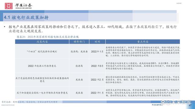 據(jù)中國核能行業(yè)協(xié)會發(fā)布的2022年能源產(chǎn)品產(chǎn)量統(tǒng)計(jì)數(shù) 據(jù)顯示,中國核能發(fā)電量僅占總發(fā)電量的4.98% ,低于 中亞和東亞平均值6.3%相比于北美的 18.8% ,北歐、西 歐和南歐的 24.2% ,東歐的 22.1% ,中國核電在低碳政 策背景下的發(fā)展?jié)摿Ψ浅4蟆?此外,無論是國內(nèi)大規(guī)模上馬核電項(xiàng)目還是核電走向國 際市場,其經(jīng)濟(jì)效益十分顯著。在國內(nèi),核電項(xiàng)目被稱 為印鈔機(jī),在雙碳減排的驅(qū)動下,以前還受到電網(wǎng)調(diào)峰 要求的各核電站,近兩年來已經(jīng)是應(yīng)發(fā)盡發(fā),機(jī)組有效 利用小時(shí)數(shù)紛紛創(chuàng)出新高,電廠效益節(jié)節(jié)攀升。核電項(xiàng) 目投資也受到各地方政府和各大銀行的大力支持和追捧。 作為一個(gè)政策導(dǎo)向型顯著的行業(yè),近年來迎來了密集的 政策利好,可以預(yù)見我國核電行業(yè)將迎來一個(gè)高質(zhì)量發(fā) 展的黃金期。