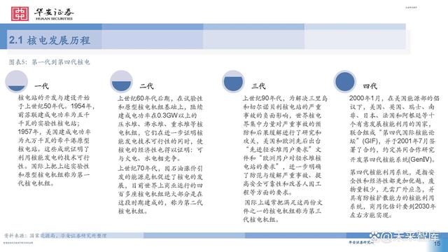 目前世界主流核電站皆采用第二代或第三代核電技術(shù)。其中,第二代和第三代的 主要核電堆型包括壓力堆和沸水堆等,在安全性和經(jīng)濟(jì)性上較前一代都有提升。第四代核電技術(shù)以在安全 性、經(jīng)濟(jì)性、核廢物處理、防止核擴(kuò)散上更為出色,代表堆型包括鈉冷快堆、鉛冷快堆、氣冷快堆、超高 溫氣冷堆等,目前主要研發(fā)試驗(yàn)階段,商業(yè)化預(yù)計(jì)在2030年左右實(shí)現(xiàn)。