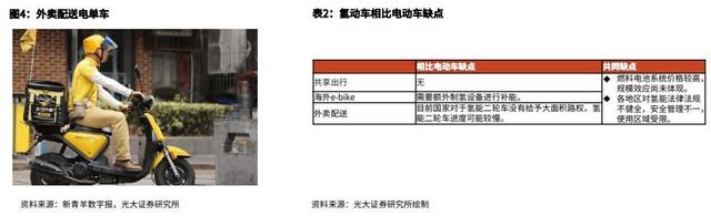 3、外賣配送:B端高頻次使用,性能更好。氫能二輪車在外賣配送等場景具有使用壽命長、補能速度快、續航里程長、安全性好等優勢。電動車使用壽命2~3年,氫動車可達3年以上。氫動車加氫時間較短,且換氫僅需數秒,電動車充電需要幾小時。一輛氫能二輪車燃料電池系統僅2~3kg,電動車48V30Ah鋰電池約10kg;對應電動二輪車普遍續航里程70-90km,氫動車同類型可達100km。(后文外賣領域采用48V30Ah的鋰電、鉛酸電池與500W,2.4L燃料電池氣態儲氫瓶對比)
